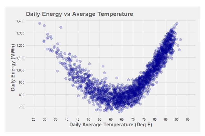 For example, whenever I get asked the question, “Why can’t we just drop average temperature into our linear regression model?” I always show a scatterplot like the one below that illustrates the nonlinear relationship between loads and temperatures.