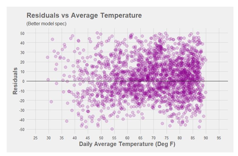 The pattern seen in this scatterplot tells us that our model is mis-specified. The horizontal line at zero is essentially our regression line, which is showing that we’re underpredicting loads at low and high temperatures and overpredicting at mid-range temperatures. If we specify our model correctly, then we would hope to see our residuals reduced to white noise with no discernible pattern (i.e., most of the data hovering around the zero line). Fortunately, when it comes to temperature, we can leverage a polynomial functional form or heating and cooling degree variables to accomplish this.