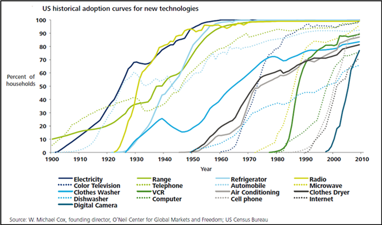 We then tried a second approach that entailed treating the data center phenomena as a new technology. Pretty much all new technologies tend to follow an S-shaped adoption path as illustrated.