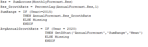 Typically, the average annual growth rates are calculated in a spreadsheet. Forecasters copy and paste results into a spreadsheet where annual averages are easily calculated. However, using the two variables described above allows for the dynamic calculation of results, removing the need to copy and paste into the spreadsheet.