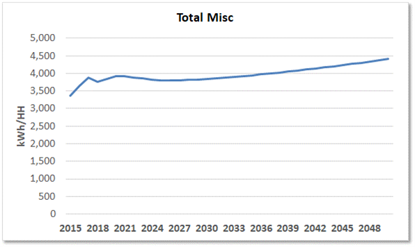 In the residential Statistically Adjusted End-Use (SAE) model framework, the miscellaneous end-use is the single largest long-term driver of residential average electricity usage. Depending on the part of the country, it accounts for 20-30% of residential usage. Compounding its significance, miscellaneous is also the only end use showing significant growth. The graph below shows U.S. miscellaneous average use per household.