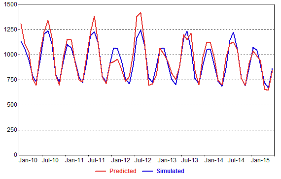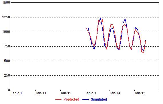Why am I missing results from 2010 through 2012? Looking closely, I see my model is estimated from 2013 through 2015. The Simulation Object develops the simulated values using the Model Predicted values, so the Model cannot calculate a simulated value because it does not have Predicted values prior to 2013.