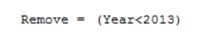 To mark the data as “bad,”I create a binary variable named “Remove” with the equation “Year <= 2013” as shown below.