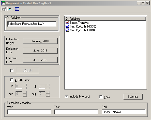 I’m using the Simulation Object in MetrixND to weather normalize historic sales. When configured, the object allows me to simulate the model replacing the X variables with a scenario. In weather normalization, the simulated X variables are the normal weather heating and cooling variables.  My simulation is shown below.